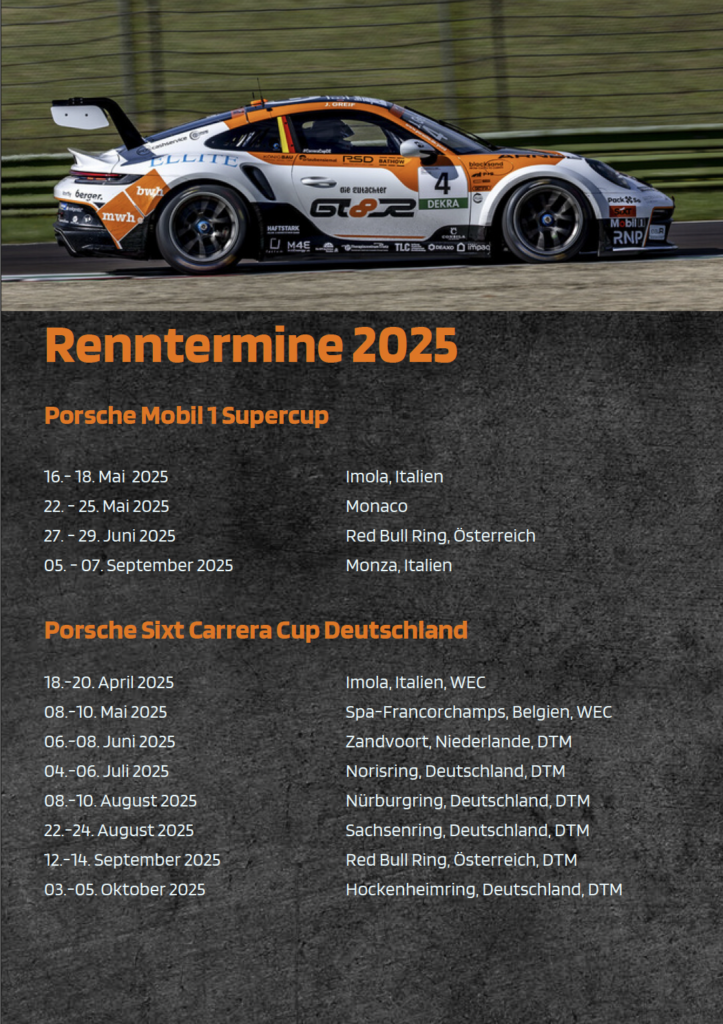 16 Rennen im Porsche Sixt Carrera Cup Deutschland und 4 Rennen im Porsche Mobil 1 Supercup erwarten uns dieses Jahr auf den größten Rennstrecken Europas – im Rahmen der WEC, DTM und der Königsklasse Formel 1! Wenn Ihr live dabei sein und hinter die Kulissen des Motorsports blicken wollt, erwarten Euch an jedem Rennwochenende unvergessliche und exklusive Einblicke!