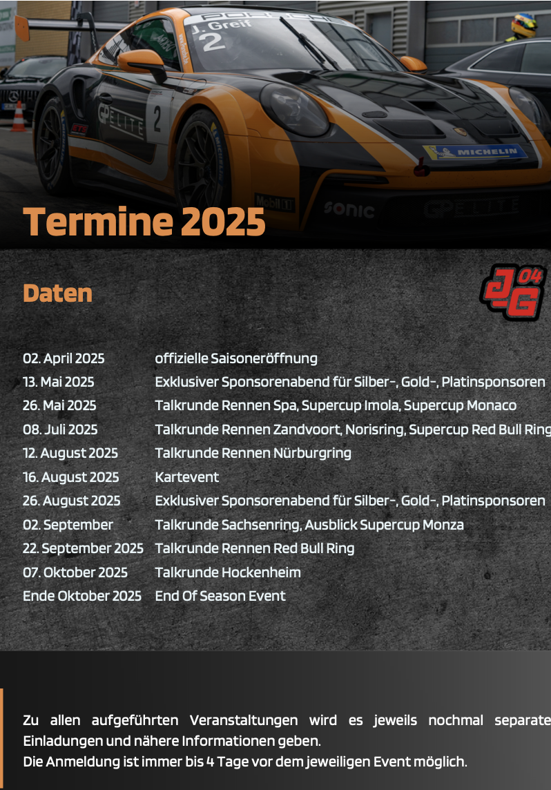 Als offizieller Sponsor lade ich dich regelmäßig zu exklusiven Events ein. Ob spannende Talkrunden, stilvolle Dinnerabende oder actionreiche Fahrtrainings – für jeden ist etwas dabei. Verpasse keine Veranstaltung mehr und sei immer hautnah dabei. Alle Termine findest du hier auf einen Blick.